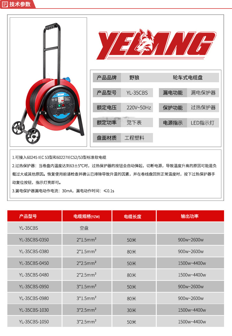 野狼電器 輪車350電纜盤(220V) YL-35CBS-0380產(chǎn)品牌子:
